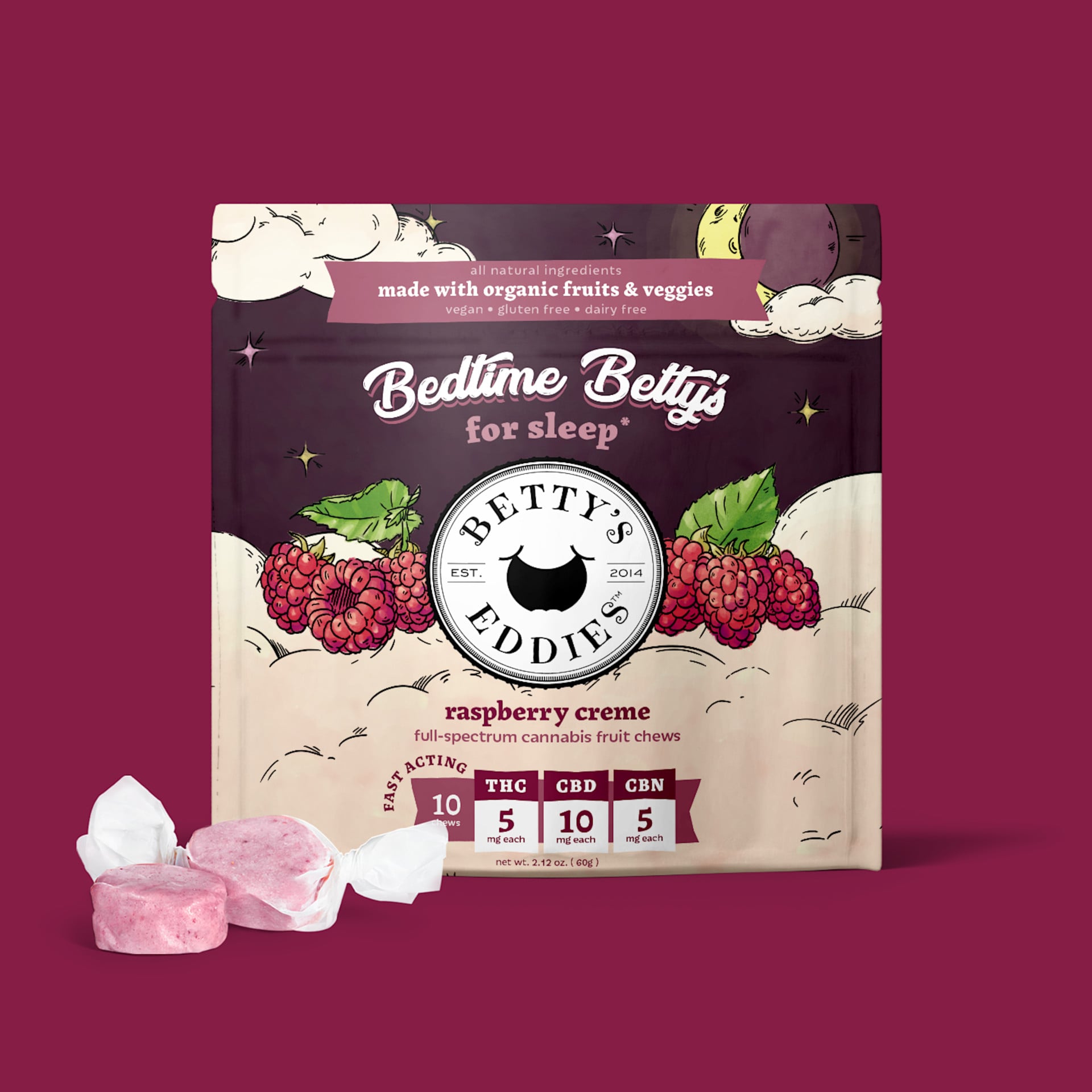 Tired of being tired? Betty’s got your back. Our newly formulated Bedtime Betty’s recipe infuses a dreamy blend of THC, CBN, and CBD into raspberry creme chews, which may aid in a night of deep sleep. Betty knows best, invest in good rest!